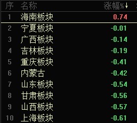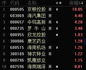 各地域板块中,仅海南板块飘红,开盘后涨幅一度达1.66%,截至发稿涨幅回落至0.74%。京粮控股涨停,海汽集团、中钨高新等个股涨幅均超4%。