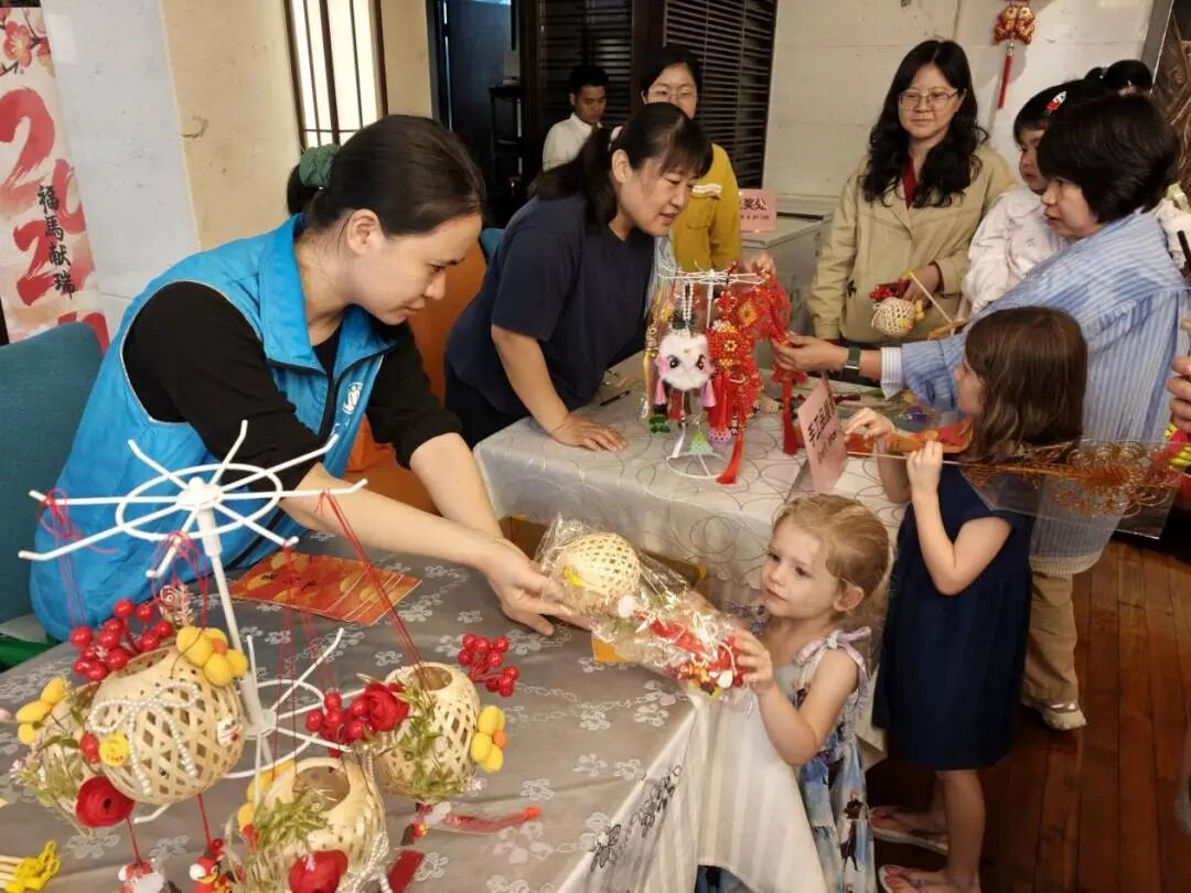 新春手工艺品展示区琳琅满目。这里陈列着精美的灯笼、中国结、生肖小马挂饰等手工艺品。部分作品进行义卖,所得款项注入白云街社区慈善基金。外国友人在选购心仪手工艺品作为文化纪念的同时,也完成了一次跨国界的爱心接力。