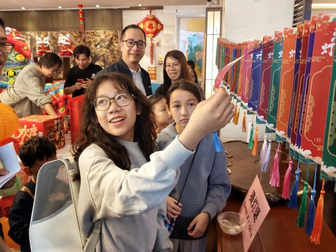 猜灯谜区人气高涨。灯谜内容涵盖中国古诗词、成语、历史人物及日常汉字,兼具知识性与趣味性。中外友人或独自沉思,或组团讨论,在破解“东方密码”的过程中,体会到了汉语的博大精深与中华智慧的幽默机巧。