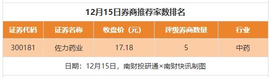 从券商推荐家数来看,12月15日有21家上市公司得到券商推荐,其中佐力药业获得5家推荐,天地科技、常宝股份等均获得1家推荐。