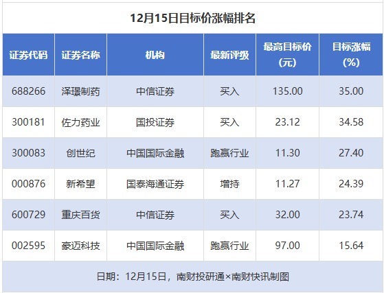 南财投研通数据显示,12月15日,券商给予上市公司目标价共6次,按最新收盘价计算,目标价涨幅排名居前的公司有泽璟制药、佐力药业、创世纪中国股票配资网官网,目标价涨幅分别为35.00%、34.58%、27.40%,分别属于化学制药、中药、自动化设备行业。