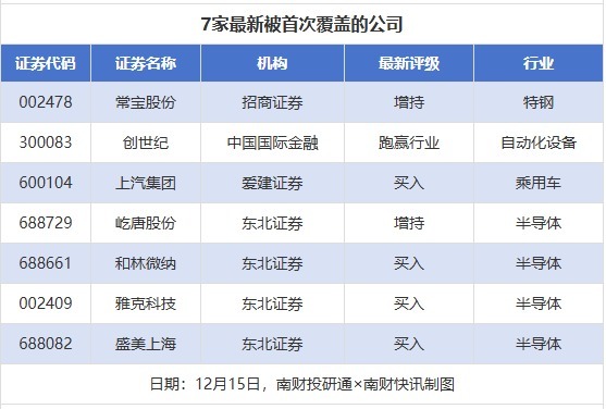 首次覆盖方面,12月15日券商共给出了7次首次覆盖,其中常宝股份获得招商证券给予“增持”评级,创世纪获得中国国际金融给予“跑赢行业”评级,上汽集团获得爱建证券给予“买入”评级,屹唐股份、和林微纳获得东北证券分别给予“增持”“买入”评级。